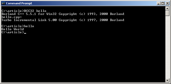 Borland C++ Compiler: Hello World Program IntroductionThis article explains how to display text in a console program using the Borland C++ Compiler. The hello program writes “Hello World” to the console. ConceptsPreprocessor DirectivesA preprocessor is a program that converts input data into output that is used as input to another program. In C++ this conversion is performed on source code before the next step of compilation. This phase of translation is called preprocessing. Lines beginning with a # character are directives for the preprocessor. #include The most common directive is the #include directive, which copies the full content of a file into the current file. The #include directive instructs the preprocessor to treat the contents of a specified file as if those contents had appeared in the source program at the point where the directive appears. Files copied with the #include directive usually contain headers for library functions and data types, which must be included before they can be used. For this reason, the #include directive usually appears near the beginning of the source code file. The files included usually contain header code (the components of the code that contain descriptions of its functionality rather than the statements themselves, often referred to as prototypes) and are thus called header files. The hello program includes <stdio.h>, the C Standard Input and Output Library, to provide the printf function. Standard StreamsInput and output operations can be performed in C++ using the C Standard Input and Output Library (cstdio, incorporated into a program using the #include <stdio.h> directive). This library uses what are called streams to operate with physical devices such as terminals. Three standard streams exist: stdin, stdout and stderr, which are automatically created and opened for all programs using the library. The standard streams are channels used by a computer program to communicate with its environment (typically a text terminal) that are connected before the program is executed. The three connections are called standard input, standard output and standard error. stdio.h is a header that contains declarations of functions used for various standard input and output operations. The printf function, used in the hello program, outputs characters to the terminal using standard output. Source CodeThe source code listing is as follows: